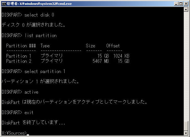 選択したHDDのパーティションのリストが表示されますので、Windows Vista/2008/7がインストールされたパーティションを確認し、「select partition 1」のようにselectコマンドでWindows Vista/2008/7がインストールされたパーティション番号を選択します。