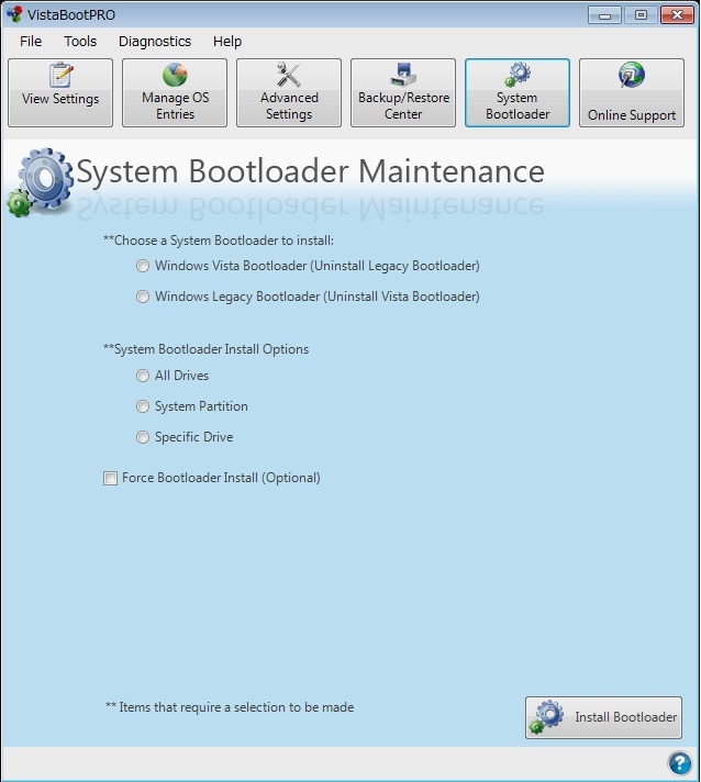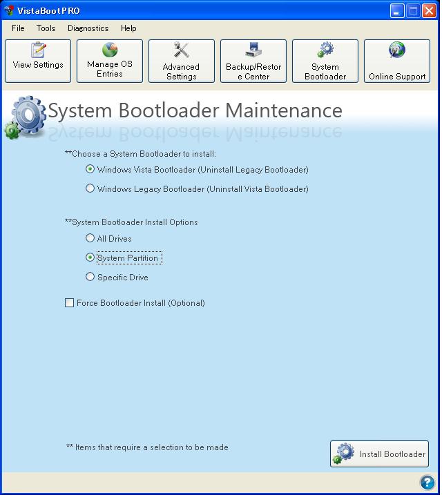2) VistaBootPROを起動し、「Syatem Bootloader」ボタンをクリックします。
