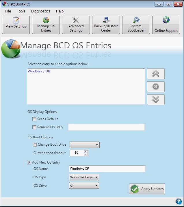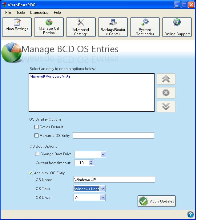 ・「Add New OS Entry」で新しいOSをOSメニューに追加します。ただし、細かなパラメータはここでは設定できませんので、パラメータの設定が必要な場合はbcdedit.exeを使うことになります。変更後は「Apply Updates」ボタンをクリックします。