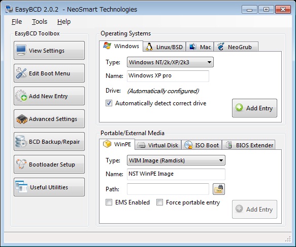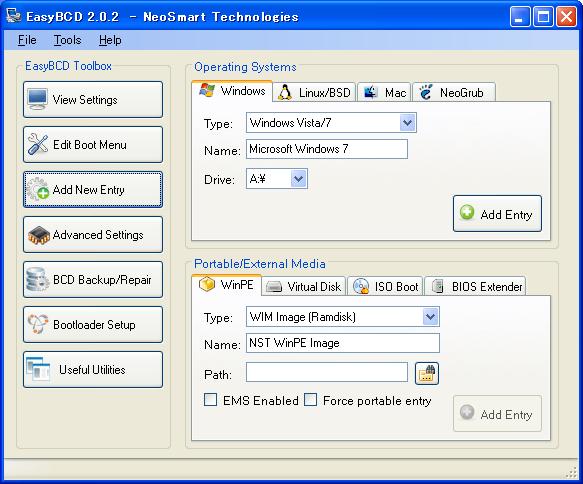 5) BootmgrのメニューにWindows 2000/XP/2003を追加するために「Add New Entry」ボタンをクリックします。