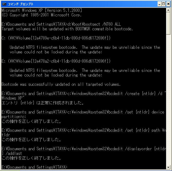 なお、Windows 2000/XP/2003が32bit版で、Windows Vista/2008/7が64bit版の場合、この方法ではbootsect.exeが動作しません (32bit環境で64bitプログラムが動作しない) ので、Windows Vista/2008/7のDVDで起動して、「システム回復オプション−コマンドプロンプト」から、bootsectコマンドを実行してください。DVDから起動できない場合は、下記の「EasyBCD」か「VistaBootPRO」を使ってください。