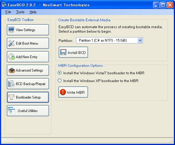 1) Windows 2000/XP/2003、またはWindows Vista/2008/7上でEasyBCDを起動します。