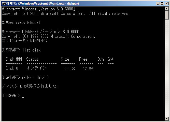 コンピュータで認識されているHDDのリストが表示されますので、Windows Vista/2008/7がインストールされているHDDを確認し、「select disk 0」のようにselectコマンドでWindows Vista/2008/7がインストールされているHDD番号を選択します。